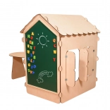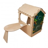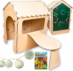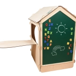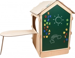 Domek zawiera dużą tablicę magnetyczno-kredową do edukacyjnych zabaw z wieloma literami.