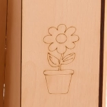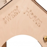 Domek zawiera również praktyczny stolik, przy którym dzieci mogą się bawić lub tworzyć. Wykonany jest z drewna o naturalnym wyglądzie, co nadaje mu estetyczny i harmonijny charakter, pasujący do każdego ogrodu lub wnętrza.