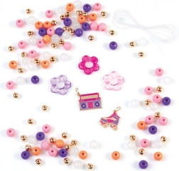 Zestaw zawiera przezroczystą elastyczną żyłkę, 23 koraliki zmieniające kolor, 49 klasycznych koralików, 39 złotych koralików, 3 kwiatowe zawieszki, 2 metalowe zawieszki, instrukcję oraz praktyczne pudełko do przechowywania.