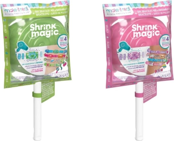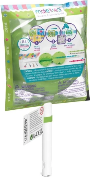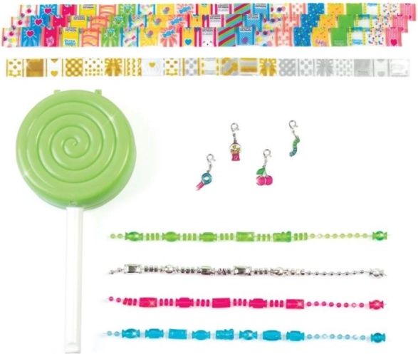 - Wszystko w jednym – pudełko w kształcie lizaka, bransoletki, zawieszki, 84 sztuki folii termokurczliwej i instrukcja.