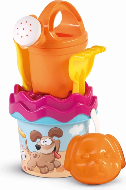 Wesoły zestaw do piasku z motywem pieska, zawierający wszystko, czego potrzebują mali odkrywcy. Zestaw obejmuje: