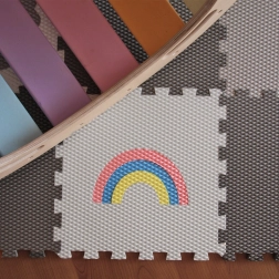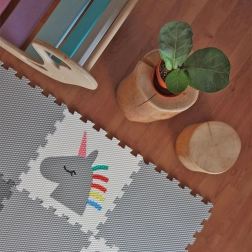Stwórz dla dzieci bezpieczny i wygodny kącik z piankową matą z 12 elementów w motywie szarego jednorożca, tęczy i zwierzątek. Elementy stabilnie łączą się dzięki systemowi zamków, podłoga jest miękka, izolująca i łatwa do czyszczenia. Materiał Vylen jest certyfikowany, bezpieczny dla zdrowia i produkowany w Czechach.