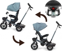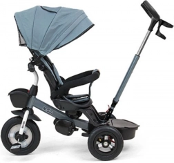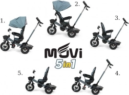 Trójkołowy rowerek MOVI jest stabilny i bezpieczny, ma nowoczesny design, wygodne profilowane siedzisko obracane o 360 stopni, które umożliwia jazdę przodem lub tyłem. Rowerek jest wyposażony w barierkę chroniącą przed wypadnięciem dziecka, trzypunktowe pasy bezpieczeństwa oraz podnóżki, a pompowane koła zapewniają cichą i komfortową jazdę. Po zdemontowaniu rączki, barierki, budki i pokrowca siedziska MOVI można używać jako klasycznego trójkołowca. Dzięki funkcji wolnobiegu dziecko może swobodnie pedałować, a kierownicą dla rodzica można nadal korygować prędkość jazdy.
