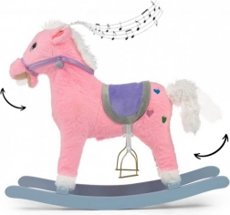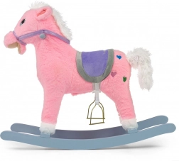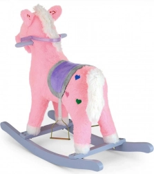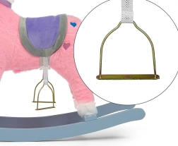 Różowy koń na biegunach przyciąga swoją delikatną barwą i wygodnym siodłem, co czyni go idealną zabawką dla najmłodszych.