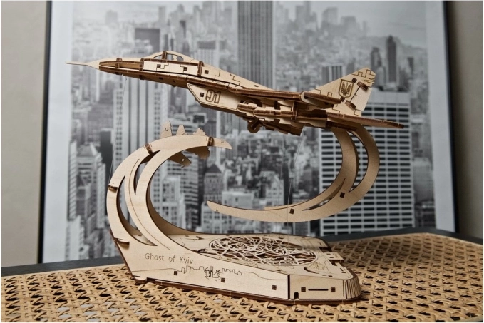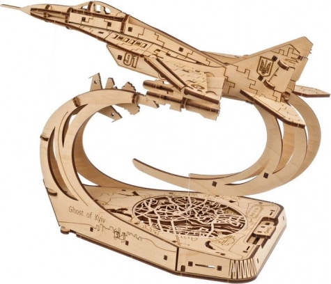 Rozkoszuj się wyjątkową drewnianą układanką 3D, łączącą precyzyjną obróbkę laserową z porywającą opowieścią o bohaterstwie. Model MiG‑29 „Ghost of Kyiv” oferuje ruchome lotki, klapy, chowane podwozie oraz odłączane rakiety. Dzięki zasadzie tensegrity model efektownie „unosi się” nad stylizowaną mapą Kijowa na designerskiej podstawce.