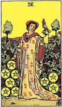 Karta 'Nine of Pentacles' przedstawia bogactwo i luksus, co jest w czytaniu tarota często pożądanym aspektem.