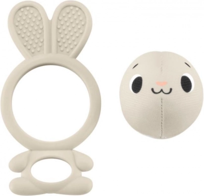 Silikonowy króliczek z teksturowanymi uszkami i otworem dla pewnego chwytu maluszka. Odłączana dzwoniąca kuleczka motywuje do ruchu i rozwija małą motorykę.