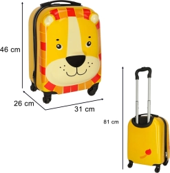 Urocza dziecięca walizka z motywem lwa idealnie sprawdzi się jako bagaż podręczny dla małych podróżników. Ma wytrzymałą plastikową skorupę, cztery kółka dla łatwego prowadzenia oraz teleskopową rączkę. Wewnątrz oferuje dwie komory – kieszeń na zamek oraz część z krzyżowymi pasami – dzięki czemu zmieszczą się wygodnie ubrania i ulubione zabawki.