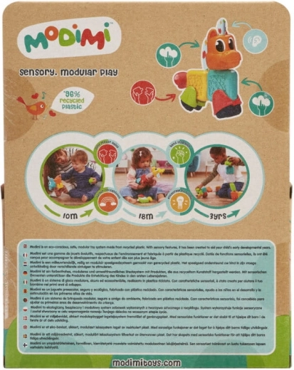Modimi Sensoryczna zabawka Koń Paco to ekologiczna, bezpieczna i modularna zabawka wykonana z plastiku z recyklingu, która wspiera rozwój zmysłów dziecka już od najmłodszych lat.