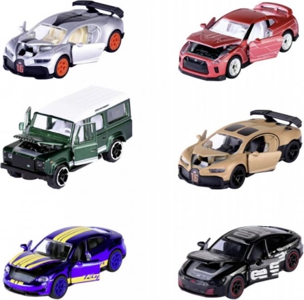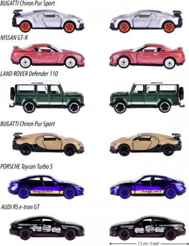 - Mix 6 modeli: AUDI RS e-tron GT (czarny), BUGATTI Chiron Pur Sport (brązowy/srebrny), LAND ROVER Defender 110 (zielony), NISSAN GT-R (czerwony), PORSCHE Taycan Turbo S (niebieski)