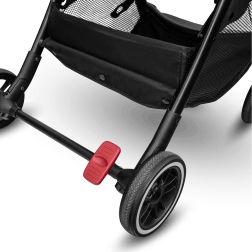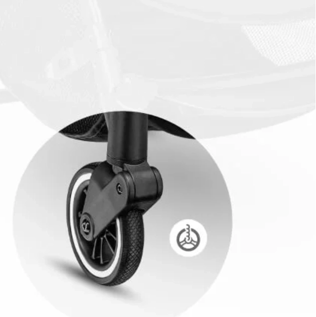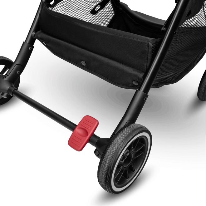 Amortyzowane koła z gumy i poliuretanu tłumią drgania i dobrze trzymają kierunek. Tylna oś jest wyposażona w praktyczny pedał nożny do szybkiego i bezpiecznego zablokowania wózka.