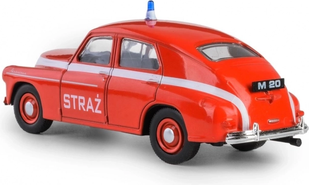 - Autentyczne odwzorowanie historycznego auta WARSZAWA M-20 w wersji strażackiej.