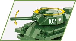 Model T-34/76 z plastikowych klocków zawiera ruchomą wieżę i koła, co przyczynia się do realistycznego wrażenia z militarnej tematyki.