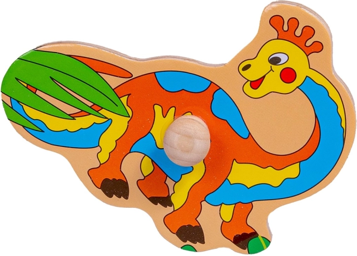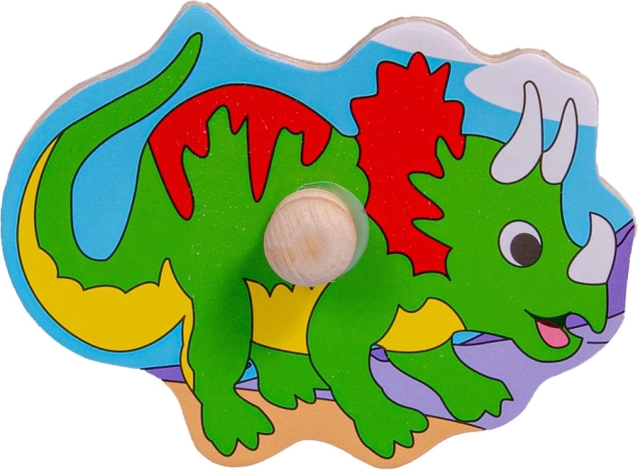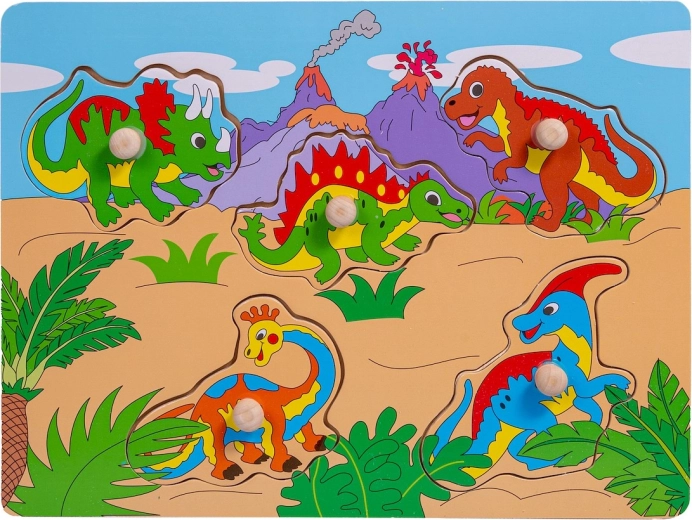 Drewniana układanka z motywem dinozaurów wspierająca rozwój dziecięcej motoryki małej i umiejętności poznawczych. Zawiera kolorowe drewniane elementy z uchwytami dla łatwej manipulacji.