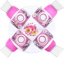 Zestaw obejmuje okrągły stół, 4 krzesła, dwa rodzaje talerzy, podkładki, pełny komplet sztućców dla 4 osób, 8 kieliszków oraz dekoracyjny wazon z kwiatami – wszystko w eleganckim biało‑różowym połączeniu.