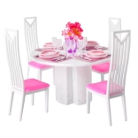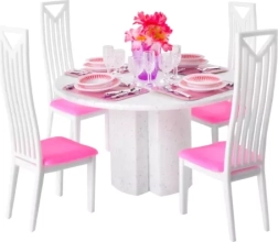 Ten dopracowany zestaw mebli zamieni każdy domek dla lalek w przytulną jadalnię. Dzięki realistycznym detalom – od różowych podkładek, przez talerze i sztućce, po kieliszki – dzieci spędzą długie godziny na zabawie w odgrywanie ról i biesiadowaniu z lalkami.