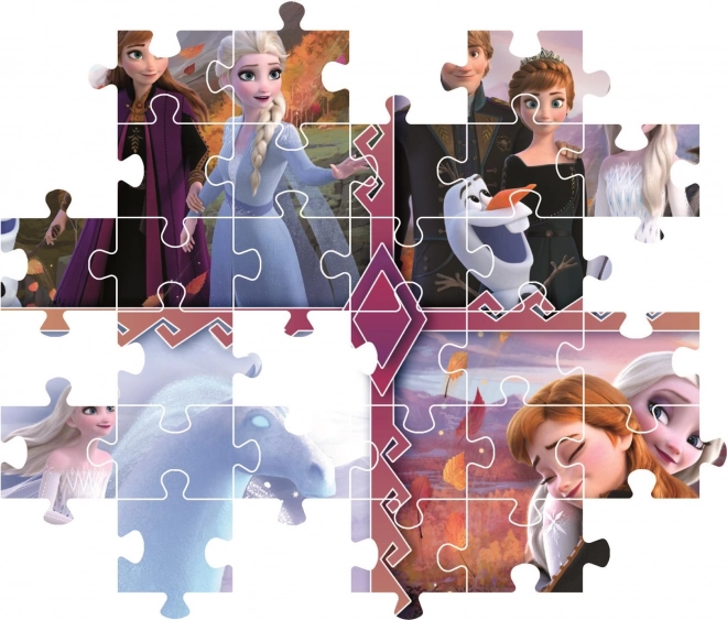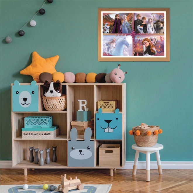 Kolaż ulubionych bohaterów i scen wnosi atmosferę przygody, przyjaźni i rodziny – od zimowych po jesienne krajobrazy, włącznie z magicznym lodowym koniem.