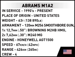 Z zestawem COBI Abrams M1A2 zbudujesz realistyczny mini model nowoczesnego czołgu podstawowego. W skali 1:72 gotowy model ma około 14 cm długości i zachowuje charakterystyczne linie oraz autentyczne oznaczenia pierwowzoru.
