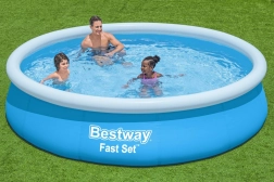 Dmuchany, naziemny basen BESTWAY Fast Set to idealny wybór do szybkiego orzeźwienia w ogrodzie. Montaż zajmuje zaledwie kilka minut – pompujesz górny pierścień, odkręcasz wodę, a ściany same unoszą się wraz z poziomem wody. Dzięki solidnemu materiałowi z wytrzymałą powłoką przetrwa codzienne rodzinne wodne zabawy.
