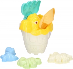 Wiaderko, pokrywka z sitkiem, 3× foremka dinozaura, grabki, łopatka