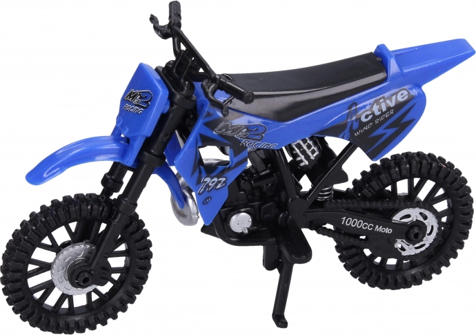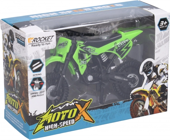 Motocykl terenowy 12 cm z kołami na wolny bieg w 3 kolorach. Kompaktowa zabawka dla małych zawodników, sprzedawana w display boxie po 12 szt.