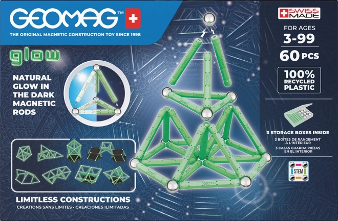 Odkryj kreatywny zestaw konstrukcyjny Geomag Glow z recyklingowanego plastiku z 60 elementami, które w ciemności świecą. Magnetyczne patyczki i metalowe kulki rozwijają kreatywność, małą motorykę oraz umiejętności STEM. W zestawie znajdują się pudełka do przechowywania dla łatwego porządkowania. Idealny dla dzieci od 3 lat.