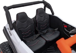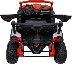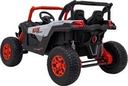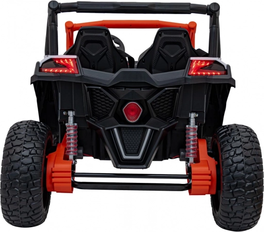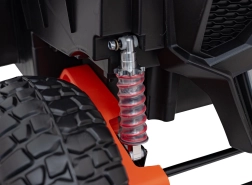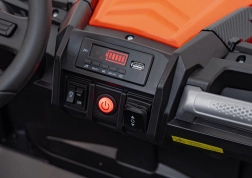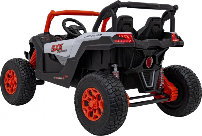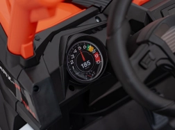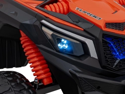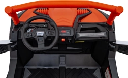 Pojazd terenowy UTV X3 w atrakcyjnym pomarańczowym kolorze to idealny wybór dla małych poszukiwaczy przygód, którzy chcą poczuć moc i frajdę z jazdy w terenie. Pojazd wyposażono w cztery silniki o mocy 200 W, co zapewnia odpowiednią wydajność poza utwardzonymi drogami.