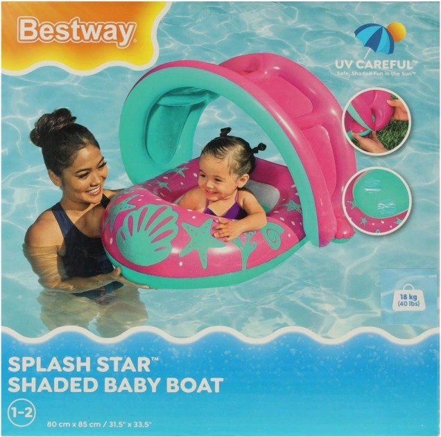 Dmuchany daszek przeciwsłoneczny zapewnia przyjemny cień i pomaga chronić delikatną skórę dziecka podczas zabawy w wodzie. Można go łatwo założyć i zdjąć w zależności od potrzeb.