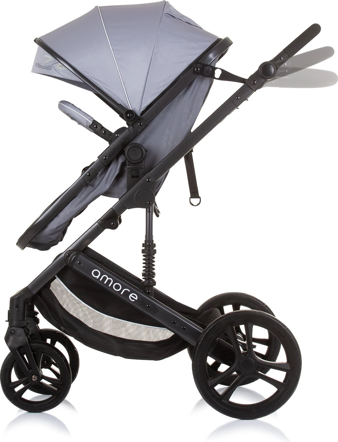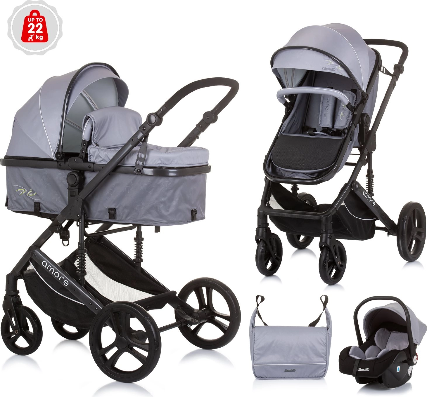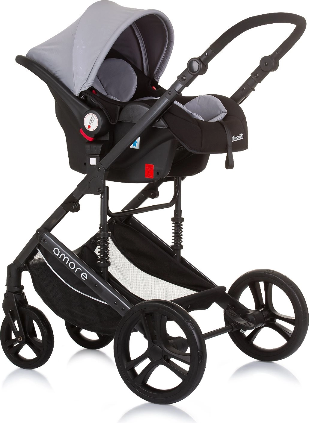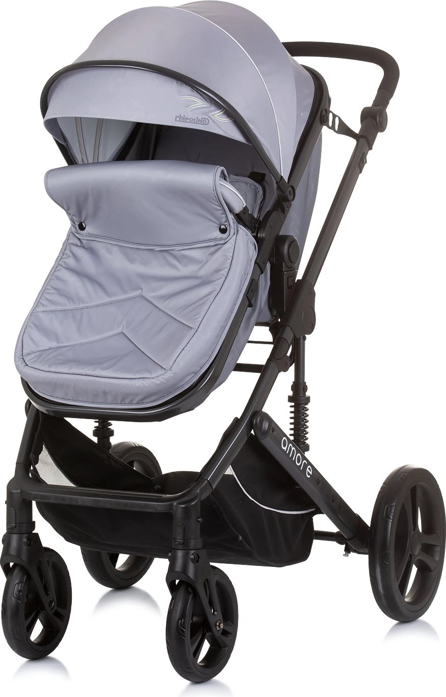 Stylowy łączony wózek CHiPOLINO AMORE 2w1 dla noworodków aż do 22 kg oferuje lekką konstrukcję, łatwą zmianę na gondolę, siedzisko obracane przodem lub tyłem do kierunku jazdy oraz bogate wyposażenie w tym torbę, pokrowiec na nóżki i uchwyt na butelkę.