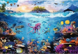 Żywe kolory, koralowce, tropikalne ryby i żółwie morskie – szczegółowa ilustracja zamienia układanie w wizualną przygodę.