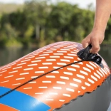 Żłobkowana dmuchana podłoga amortyzuje wstrząsy i zwiększa stabilność podczas siedzenia i wiosłowania – idealna na dłuższe, relaksacyjne wyprawy.