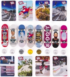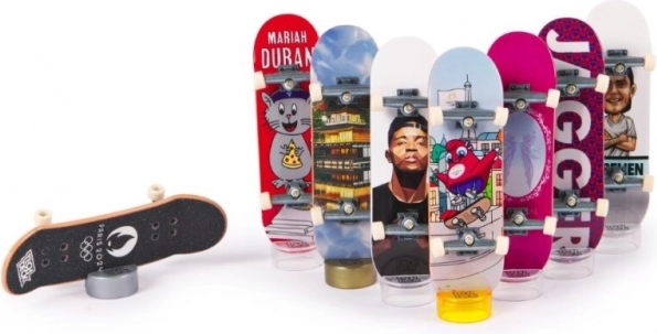 Każdy fingerboard w tej kolekcji ma autentyczny wzór od światowo znanych firm skateboardingowych. Częścią są także 8 kart kolekcjonerskich, przedstawiających wybranych skateboardzistów w akrobacjach. Ustaw swoje fingerboardy na stojakach z złotymi, srebrnymi i brązowymi uchwytami i z dumą eksponuj swoje skarby.