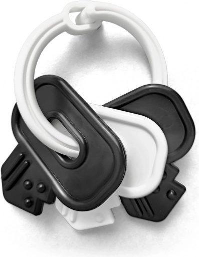 Kontrastowe czarno-białe kluczyki to idealna pierwsza zabawka dla niemowląt – wspiera koncentrację i percepcję wzrokową we wczesnym wieku. Dzięki połączeniu plastiku i silikonu kluczyki są lekkie, wytrzymałe i przyjemne w dotyku. Odpowiednie do trzymania małymi rączkami i codziennego odkrywania.