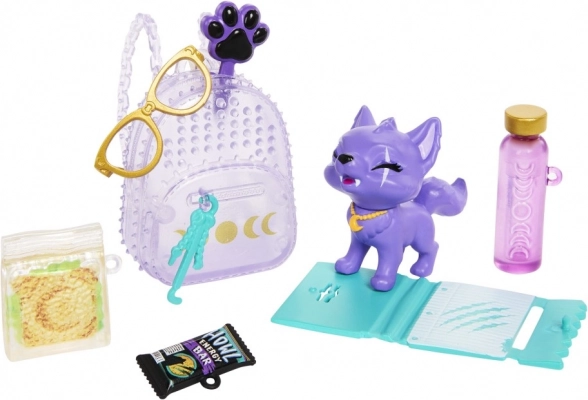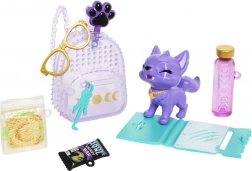 Strój z „pazurem” tworzą fioletowa futrzana kurtka, spodnie w panterkę, uzupełnione o naszyjnik, pasek i buty na platformie. Bogaty zestaw akcesoriów – plecak, okulary, butelka na napój, przekąska i baton, organizer oraz szczotka dla pupila – wspiera wyobraźniową zabawę i ekspozycję na półce.