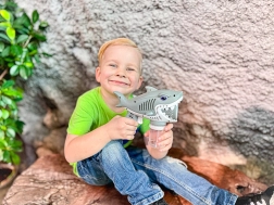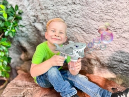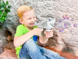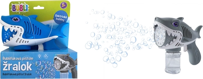 Dzieci uwielbiają bańki, a z pistoletem do baniek mydlanych w kształcie rekina będą się bawić godzinami. Działa na zasadzie naciśnięcia spustu, który uruchamia mechanizm dmuchający powietrze przez płyn do baniek. Po naciśnięciu spustu nieprzerwanie wypuszczana jest duża ilość baniek, co dzieci uwielbiają.