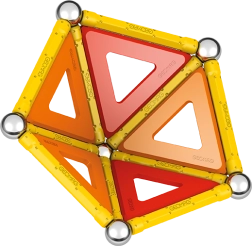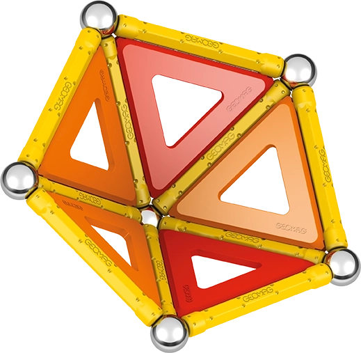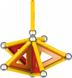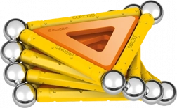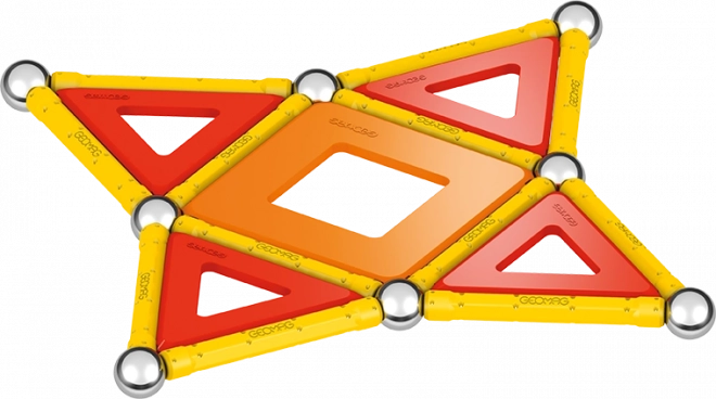 Co znajdziesz w opakowaniu: 12 żółtych magnetycznych prętów, 12 stalowych kulek, 8 trójkątnych wypełnień, 2 kwadratowe wypełnienia, 1 pomarańczowe wypełnienie w kształcie pięciokąta oraz plastikowe pudełko na kulki i pręty.