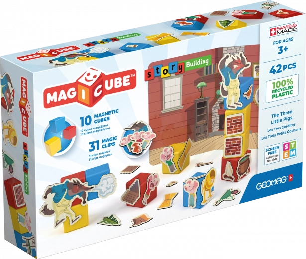 Zestaw zawiera 10 solidnych magnetycznych klocków i 31 ilustrowanych klipsów z motywami świnek, wilka i budowy domków, więc mali twórcy mogą opowiedzieć znaną historię lub wymyślać nowe. Materiały są bezpieczne dla zdrowia i wykonane z typową szwajcarską precyzją marki Geomag.