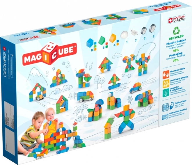 GEOMAG MAGICUBE SHAPES oferuje dzieciom od 1. roku życia mądrą zabawę magnetycznymi klockami i kształtami, które łatwo i bezpiecznie się ze sobą łączą. Zestaw zawiera 25 elementów, w tym kółka, dzięki czemu mali konstruktorzy mogą tworzyć nie tylko wieże i domki, ale także proste pojazdy i ruchome modele. Kolorowe wykonanie wspiera rozpoznawanie barw i kształtów, małą motorykę i wyobraźnię przestrzenną.