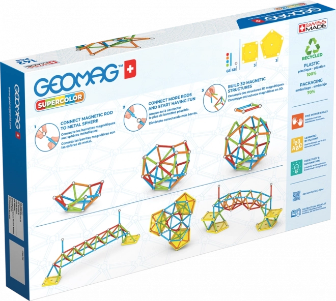 Odkryj kreatywny świat magnetycznych konstrukcji z zestawem GEOMAG Supercolor zawierającym 142 elementy wykonane w 100% z plastiku z recyklingu. Kolorowe pręciki, stalowe kulki i podstawki pozwalają budować nieskończone modele 3D, które rozwijają kreatywność, wyobraźnię przestrzenną i małą motorykę. Szwajcarska jakość, bezpieczne materiały i długa żywotność czynią ten zestaw idealnym wyborem dla dzieci i dorosłych.