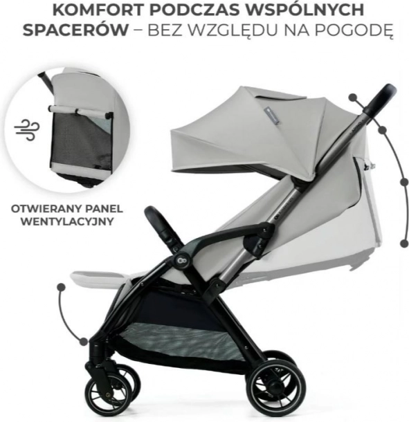 Dziecku oferuje 4-stopniową regulację oparcia od pozycji siedzącej do leżącej, regulowany podnóżek, miękkie 5-punktowe pasy z osłonkami oraz dużą budkę z panelem wentylacyjnym i okienkiem do kontaktu. Nieprzebijalne koła z przednim obrotem 360° ułatwiają manewrowanie w mieście i w podróży.