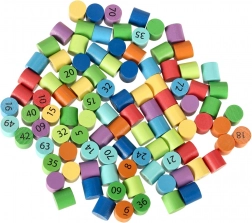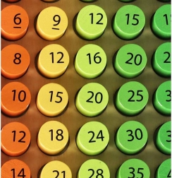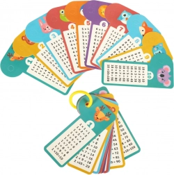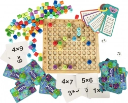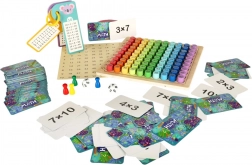 - drewniana tabliczka; 100× kołeczek/żeton z liczbami; przegląd odpowiedzi; tabliczka mnożenia 10×10; 100× karta z zadaniem; 4× figurka/pionek; 2× kostka