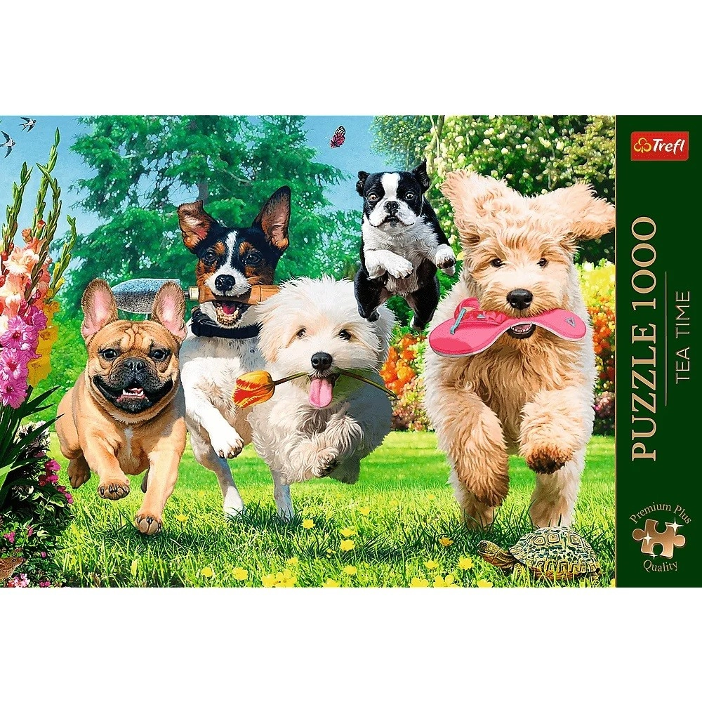 Figlarne psy w rozkwitającym ogrodzie wnoszą energię, emocje i dopracowaną ilustrację, która ucieszy zarówno początkujących, jak i doświadczonych miłośników puzzli.