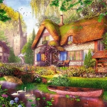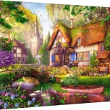 Ilustracja przytulnej chatki nad jeziorem, pełna barw i detali, zachwyci miłośników malowniczych krajobrazów i spokojnych chwil przy puzzlach.