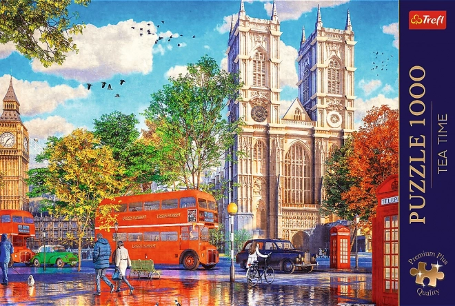 Szczegółowy motyw z czerwonymi autobusami doubledecker, budką telefoniczną i zabytkami zachwyca kolorami i atmosferą.