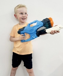 Wytrzymałe plastikowe wykonanie, ergonomiczny uchwyt i spust o płynnym działaniu gwarantują wygodne i bezpieczne użytkowanie. Futurystyczny design w niebiesko‑czarnej kolorystyce spodoba się małym i dużym wojownikom i zachęci do aktywnego ruchu na świeżym powietrzu.