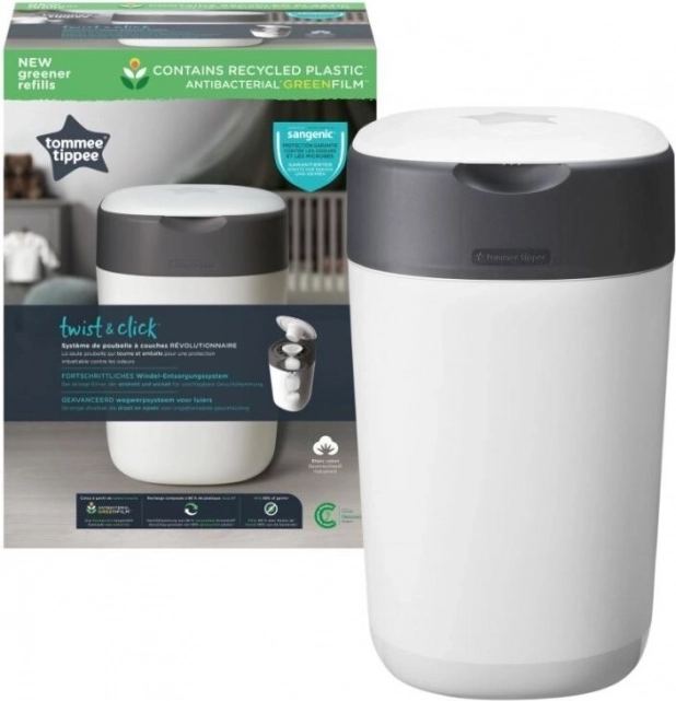 Higienicznie i bez zapachu: Składnik antybakteryjny w folii eliminuje 99% bakterii, a cytrynowy zapach folii chroni pokój dziecięcy przed nieprzyjemną wonią. Dzięki technologii Twist & Click pielucha jest łatwo owijana folią poprzez obrócenie mechanizmu pod pokrywą.