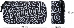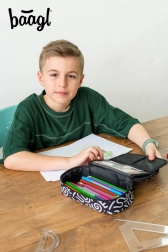 Piórnik chwali się czarno-białym tekstylnym wyglądem z abstrakcyjnymi wzorami i napisem 'Baagl'. Jego stylowy design jest idealny dla tych, którzy dbają o modę także w przyborach szkolnych.
