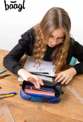 Z niebiesko-fioletowym wzorem oraz logo baagl, ten piórnik łączy nowoczesną estetykę z funkcjonalnością.