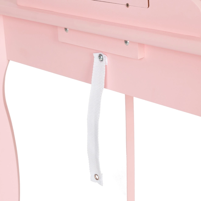 Toaletka wykonana jest z wysokiej jakości drewna i płyty MDF dla długiej trwałości. Bezpieczeństwo zwiększa możliwość zakotwienia do ściany za pomocą paska i śruby, aby zapobiec przewróceniu podczas zabawy. W zestawie znajduje się stabilny i wygodny taborecik, który współgra z elegancko profilowanymi nogami toaletki.