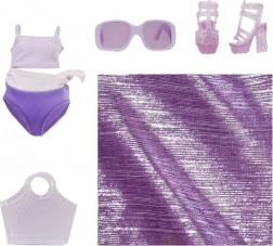 Akcesoria obejmują fioletowe ubrania, okulary przeciwsłoneczne, buty i małą torebkę, co pozwala na różnorodne modyfikacje modowe i tematy takie jak plaża czy lato.